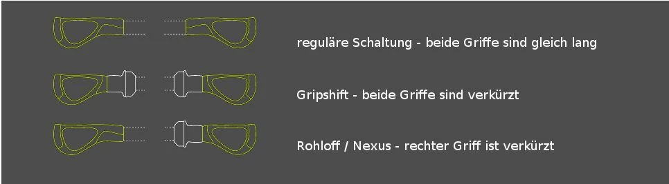 - Variantes (à choisir en option) : Regular: les deux poignées sont de la même longueur // Rohloff® / Nexus®: poignée droite raccourcie // Gripshift®: les deux poignées sont raccourcies